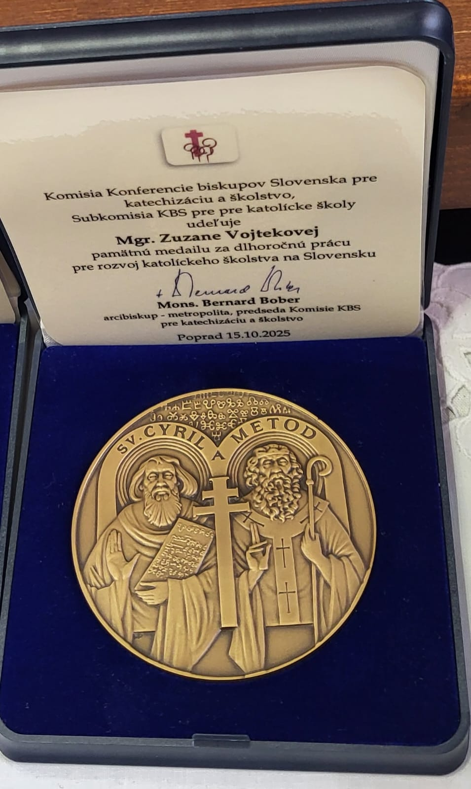 Mgr. Zuzka Vojteková získala Pamätnú medailu sv. Cyrila a Metoda za dlhoročnú a obetavú prácu, pedagogické majstrovstvo a osobný prínos k rozvoju katolíckeho školstva na Slovensku. Jej pôsobenie je charakteristické nielen odbornosťou, ale aj hlbokou vierou, ľudskosťou a snahou formovať žiakov v duchu kresťanských hodnôt, ktoré sú základom výchovno-vzdelávacieho procesu našej školy.